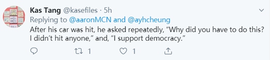 这也是为何当他遭到了暴力袭击后,视频中可以听到他非常困惑和无奈地对暴徒们说到:我是支持民主的,也没有要撞你们,你们为何要打我?