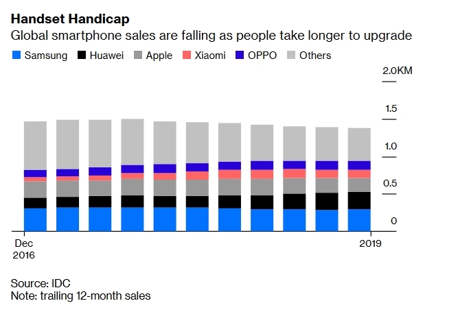 随着人们升级更换手机的周期延长,全球智能手机销量正在下降