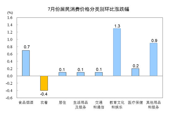 7月份,全国居民消费价格环比上涨0.4%。其中,城市上涨0.4%,农村上涨0.3%;食品价格上涨0.9%,非食品价格上涨0.3%;消费品价格上涨0.2%,服务价格上涨0.7%。
