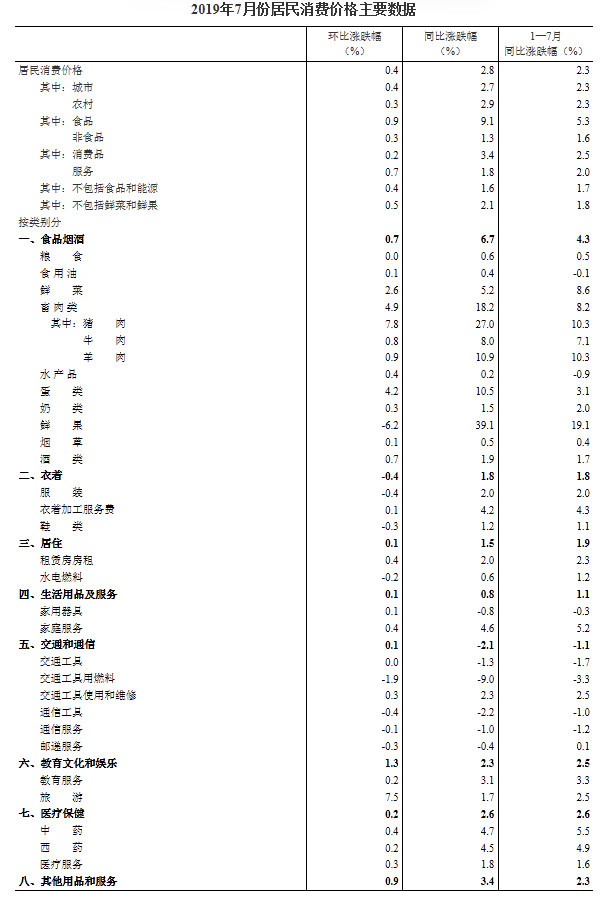 2019年7月份居民消费价格同比上涨2.8%