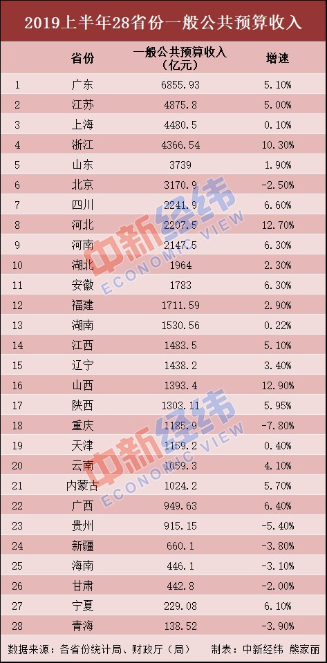 中新经纬客户端8月10日电 (熊家丽) 近日,广东、北京、安徽、云南等28个省份陆续公布了上半年地方一般公共预算收入情况,在2万亿元大规模减税降费政策的背景下,各省份如何化解财政收支矛盾,引起大众广泛关注。