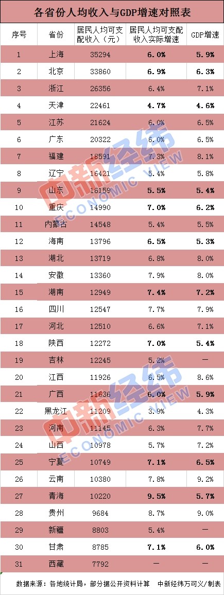 中新经纬客户端8月11日电 (万可义) 截至目前,除了西藏、新疆和吉林,全国已有28个省份揭晓经济半年报。中新经纬客户端梳理发现,上海、北京、天津、青海、甘肃等12个省份上半年居民人均可支配收入实际增速(扣除价格因素)跑赢当地GDP;青海和贵州的人均可支配收入实际增速居全国前二,分别为9.5%和8.7%。