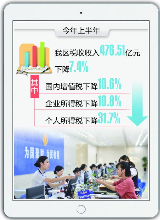 来自新疆维吾尔自治区统计局的数据显示,今年上半年,新疆税收收入476.51亿元,下降7.4%。其中,国内增值税下降10.6%,企业所得税下降10.8%,个人所得税下降31.7%。