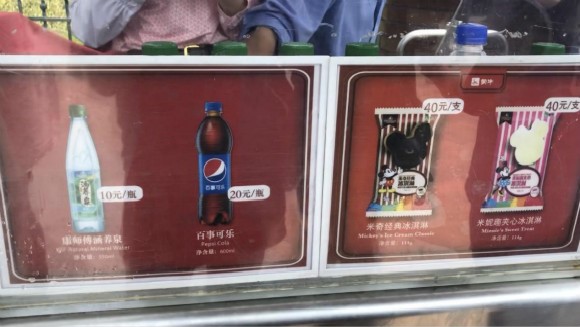 记者入园后发现,基本每隔几米就有销售食品饮料的餐车及店铺,一瓶矿泉水标价10元,一瓶可乐20元,一支冰淇淋40元,爆米花35元一盒。