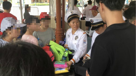 因随身携带了一大袋包括寿司、面包等食物,一家四口只能站在安检边上,狼吞虎咽吃掉尽可能多的食物。父亲一边吃一边叹息说,第一次来乐园,并不知道禁带食物的规定。刚在地铁口买的食物就这么扔掉,太浪费了。