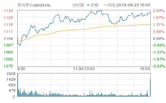 【腾讯证券】8月23日,截至收盘,贵州茅台涨2.36%,报1130.10元,成交额449578万元,连创历史新高,总市值突破14000亿元。