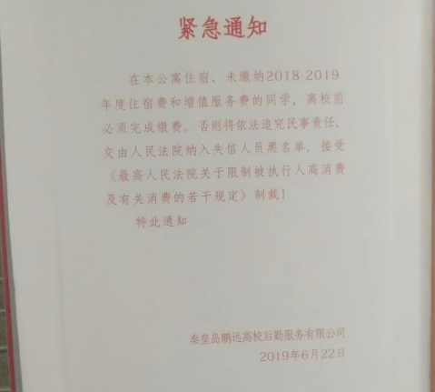 芝芝告诉红星新闻,在每一栋鹏远公寓楼下,都张贴了红色字体的告示,根据芝芝提供的图片,红星新闻看到上面写道,对于未缴纳费用的学生,将“依法追究民事责任,交由人民法院纳入失信人员黑名单,接受《最高人民法院关于限制被执行人高消费及有关消费的若干规定》制裁。”告示落款为“秦皇岛鹏远高校后勤服务有限公司”。