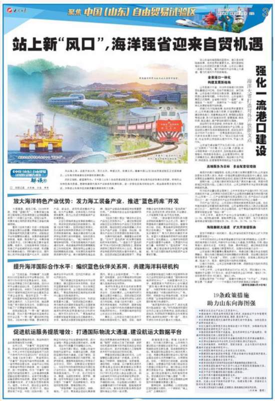 风好正扬帆,蔚蓝展作为。《中国(山东)自由贸易试验区总体方案》突出海洋经济发展方式创新,将依托山东特色海洋资源,围绕构建现代海洋产业体系和发展机制,进一步强化在海洋科技合作、航运服务等方面先行先试,为推进山东海洋经济高质量发展提供有力支撑。