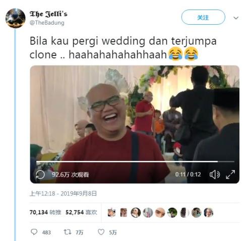 据报道,9月8日,在社交媒体上属名The Badung的男子发出一则在马来西亚参加的婚礼视频。该男子身穿红色上衣和牛仔裤,留着光头,体型微胖。