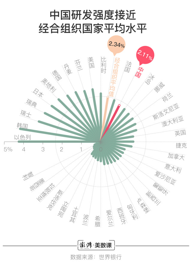 在2000年时,中国的研发强度还不到1%,但到2013年时,中国的这一数值已经超过了2%,迈过了创新型国家的门槛。目前,中国的研发经费投入强度已达到中等发达国家水平,超过了多数经合组织的成员国。