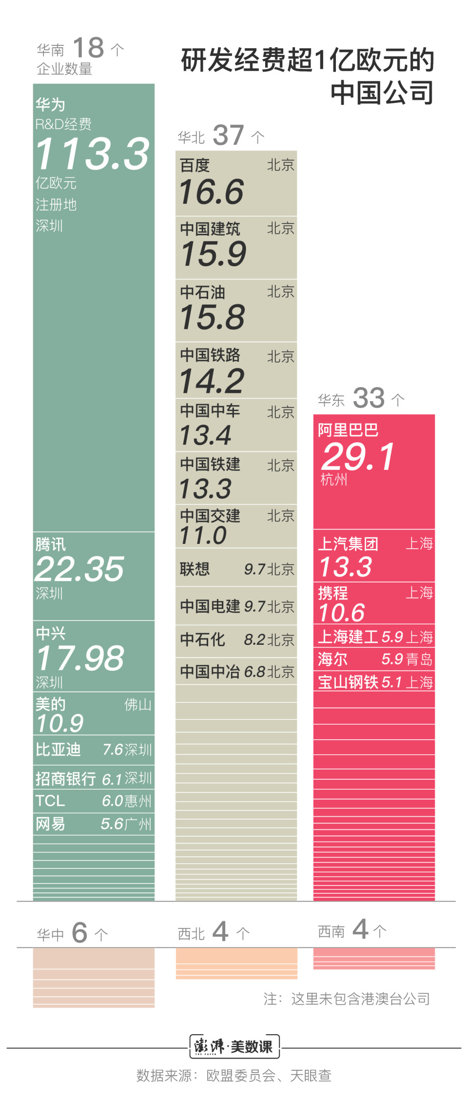 欧盟委员会在去年12月发布了《2018年欧盟工业研发投资排名》(The 2018 EU Industrial R&D Investment Scoreboard),针对全球46个国家和地区的2500家主要企业在2017~2018年度的研发投入情况进行了排名。在这份表单中,研发经费达到1亿欧元的中国大陆公司有102家,按照公司注册地去统计,就会看到北上深基本包揽了中国科研投入最多的企业。