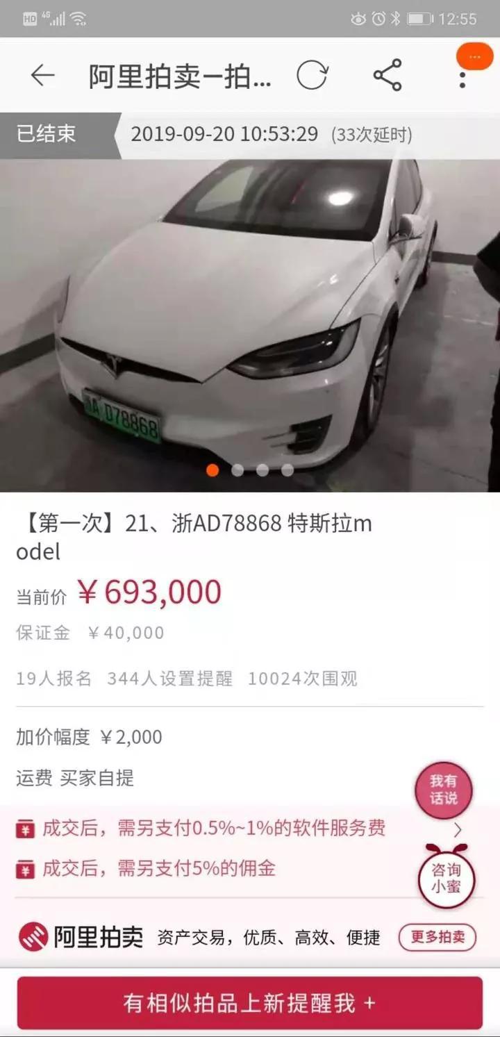 “特斯拉model”47.5万元起拍,69.3万元成交;