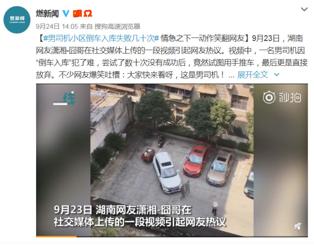 【#男司机小区倒车入库失败几十次# 情急之下一动作笑翻网友】9月23日,湖南网友潇湘-囧哥在社交媒体上传的一段视频引起网友热议。视频中,一名男司机因“倒车入库”犯了难,尝试了数十次没有成功后,竟然试图用手推车,最后更是直接放弃。不少网友爆笑吐槽:大家快来看呀,这是男司机!