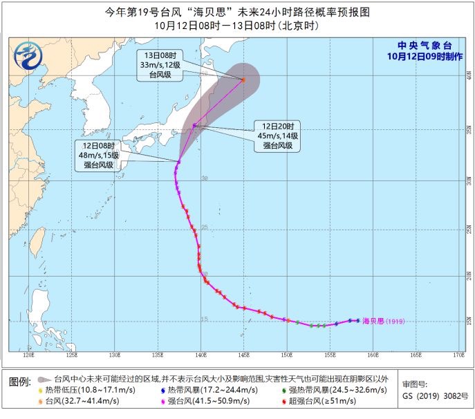 登陆后,“海贝思”将穿过日本本州岛东南部地区,13日凌晨移入日本以东洋面,并逐渐变性为温带气旋。