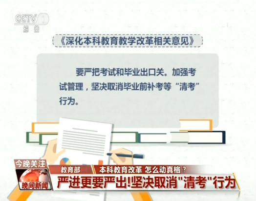 《意见》指出,要严把考试和毕业出口关。加强考试管理,坚决取消毕业前补考等“清考”行为。近年来,在部分高校存在这样一种现象:一些学生在毕业前如果还有“挂科”,学校为了保证毕业率,在毕业前为学生增加一次补考的机会,而且“清考”相对容易通过。
