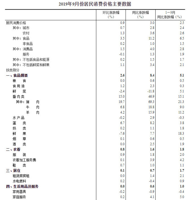 2019年9月份,全国居民消费价格同比上涨3.0%。其中,城市上涨2.8%,农村上涨3.6%;食品价格上涨11.2%,非食品价格上涨1.0%;消费品价格上涨4.0%,服务价格上涨1.3%。1--—9月平均,全国居民消费价格比去年同期上涨2.5%。