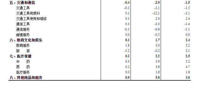 其他七大类价格同比六涨一降。其中,其他用品和服务、医疗保健、教育文化和娱乐价格分别上涨5.8%、2.2%和1.7%,衣着、居住、生活用品及服务价格分别上涨1.6%、0.7%和0.6%;交通和通信价格下降2.9%。