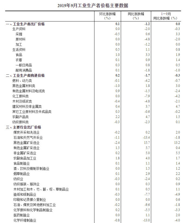 2019年9月份,全国工业生产者出厂价格同比下降1.2%,环比上涨0.1%;工业生产者购进价格同比下降1.7%,环比上涨0.2%。1—9月平均,工业生产者出厂价格与去年同期持平,工业生产者购进价格下降0.3%。