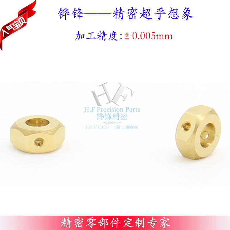 惠州市惠城区汝湖镇水苑工业区铧锋精密,专业定制各类精密五金零件,我司主要以高精度,专做复杂高难度的零件著称,在零件定制行业有着非常高的声誉,我司主要设备有,4轴联动走心机,9轴联动走心机,4轴精雕机,4轴加工中心,磨床,铣床,线割等一系列精密加工设备,我司定制的产品主要用于医疗机械行业,机械设备行业,航空航天行业,精密电子行业等等,这款铜六角固定螺丝为电子行业的客户定制,产品对精度和光洁度要求都非常的高,不能直接用用六角铜棒加工,因为六角棒的对边精度有正负0.1mm左右,而客户对我们的要求是对边0.02mm,并且侧面还有一个M1.5的螺牙位用来固定接线的。所以我司采用4轴联动的走心机,用铜的圆棒来加工,一次成型,产品出来后,客户对产品的满意度非常好,都赞扬铧锋定制的零件非常的高端,品质好,精度高,并当场决定和铧锋保证长期的合作关系。铧锋精密欢迎广大新老客户前来定制各类高精度,高难度的精密零件。