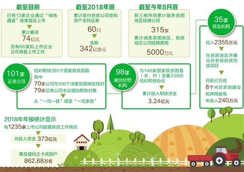 此外,中国期货业协会推出“一司一结对”结对帮扶措施,推动98家期货经营机构与146家国家级贫困县(乡、村)签署238份结对帮扶协议,累计投入帮扶资金3.24亿元;中国基金业协会设立“基金行业扶贫公益联席会制度”,倡导35家基金机构投入帮扶资金2355万元,在贫困地区开展光伏农场扶贫兜底项目,目前已完成8个光伏农场建设和并网发电,年收入达240万元,可实现800名贫困人口稳定脱贫;中国上市公司协会和上海、深圳证券交易所积极推动上市公司参与脱贫攻坚。2018年年报统计显示,有1235家上市公司披露扶贫工作情况,共投入帮扶资金373亿元,涵盖农林产业扶贫、资产收益扶贫、旅游扶贫、电商扶贫和消费扶贫等,惠及862.68万名建档立卡贫困户。