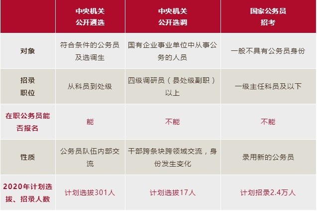 许多人会问,三者到底有何区别?哪些人能参加中央机关公开遴选、选调,哪些人又能参加国考?为什么中央机关公开遴选人数明显多于选调人数?