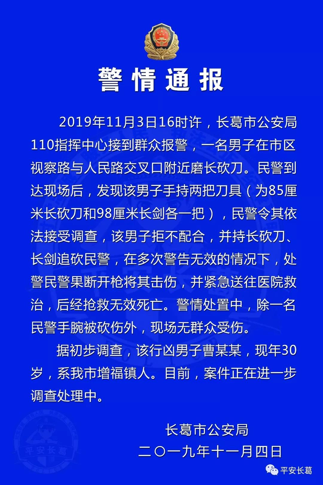 通报称,11月3日16时许,该局110指挥中心接到群众报警,一名男子在市区视察路与人民路交叉口附近磨长砍刀。民警到达现场后,发现该男子手持两把刀具(为85厘米长砍刀和98厘米长剑各一把),民警令其依法接受调查,该男子拒不配合,并持长砍刀、长剑追砍民警,在多次警告无效的情况下,处警民警果断开枪将其击伤 ,并紧急送往医院救治,后经抢救无效死亡。 警情处置中 ,除一名民警手腕被砍伤外 ,现场无群众受伤。
