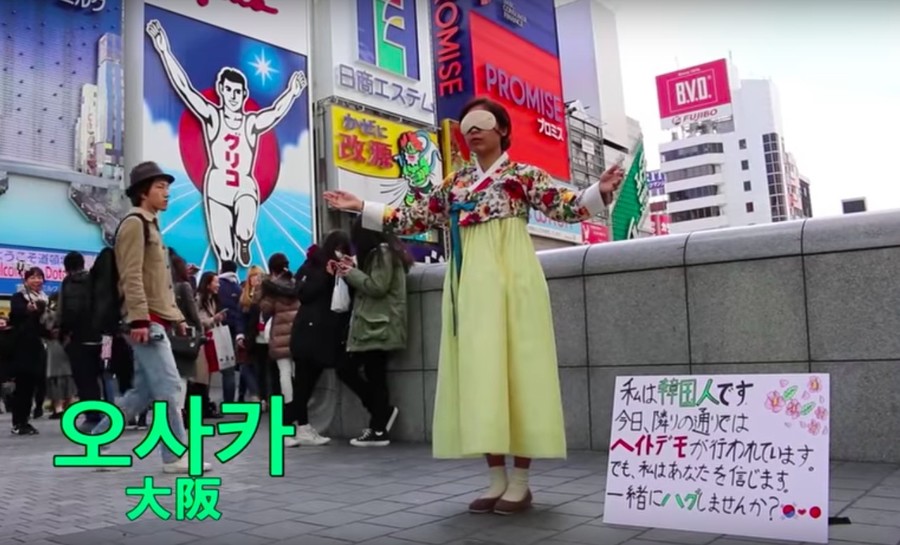 尹秀荣蒙眼站在大阪街头(BuzzJapan)
