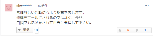 这位网友则真挚地表达了感谢之情,“衷心感谢她出色的行动,希望冲绳不是她的终点,以后在自己国家也继续活动,向全世界传递自己的信念。”
