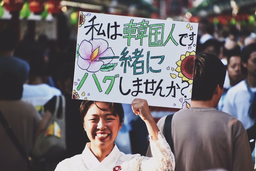 尹秀荣手举的牌子上写着“我是韩国人,可以给我一个拥抱吗”(BuzzJapan)