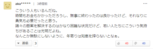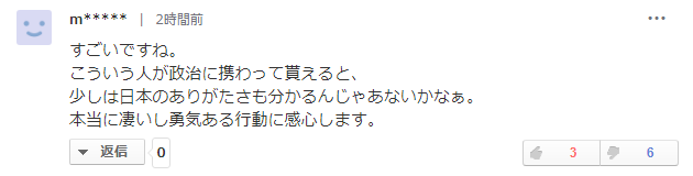 这位网友说道,“真是了不起呀。如果让这样的人从事政治的话,多多少少能让他们明白日本的重要性吧。真的是非常有勇气的行动,十分感动。”