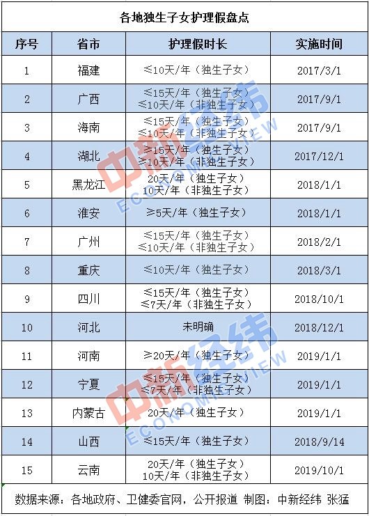 据中新经纬客户端不完全统计,截至目前,已至少有云南、山西、内蒙古、宁夏、河南、河北、四川、重庆、黑龙江、湖北、海南、广西、福建等13省份,以及淮安、广州等2市出台了与“独生子女护理假”相关的具体规定。