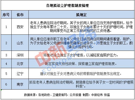中新经纬客户端梳理发现,截至目前,共有山东、西安、深圳、北京、辽宁、南京等6地探索建立独生子女护理假制度。此外,多地提出全面放开养老市场,引导和鼓励社会力量、市场主体积极参与养老服务供给。