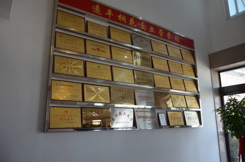 董事长张红女士讲解到:遂平桐花面业多次被农业部授予“质量管理和各单位”等荣誉称号,被中国粮食行业协会评为“全国放心粮油示范企业”,被河南省人民政府授予“河南省农业产业化重点龙头企业”、“河南省农业产业化集群”、“河南省农业产业化联合体”等称号,被河南省科学技术厅评为“河南省科技型中小企业”,2018年9月被河南省工商业联合会评为“2018年河南民营企业省会责任100强”,公司在2019年3月又顺利通过质量、环境、职业健康安全和能源四大管理体系认证,2019年9月,公司生产的“豫桐花”牌饺子粉被评为第二十二届中国农产品加工业投资贸易洽谈会优质产品。