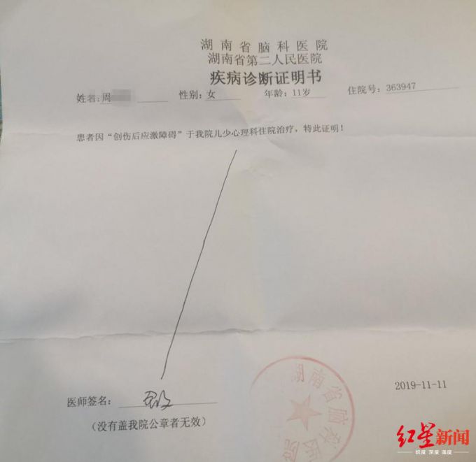 周某:她情绪非常不稳定,很多天一句话都不说。我们把她送到了医院,在儿少心理科病房治疗,鉴定结果是“创伤后应激障碍”。半个多月后,我们把她接了出来,她父亲把她接到了广东惠州。医生说她精神容易受刺激,病情会波动,要随时就诊。