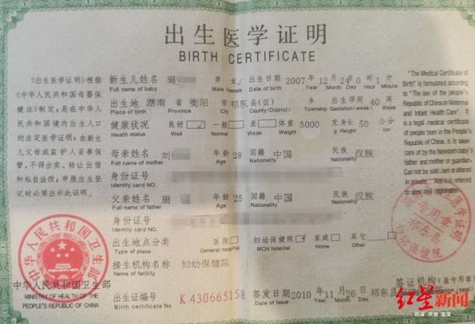 周某:我们有女孩的出生证明、身份证、户口薄,所有的信息都一致。她的出生日期是2007年12月24日,到现在为止,仍然未满12周岁。相关证据也提供给了官方,女孩的出生日期一天都没有错,绝对准确。如果错一天,我们都愿意负法律责任。我儿子的二胎是2018年9月5日出生,是早产,孩子患有脑瘫。