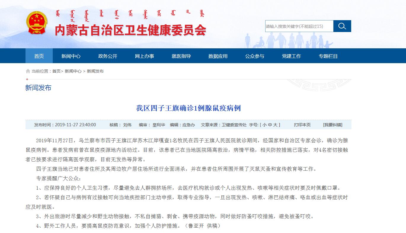 原标题:内蒙古四子王旗确诊1例腺鼠疫病例,患者曾在鼠疫疫源地活动