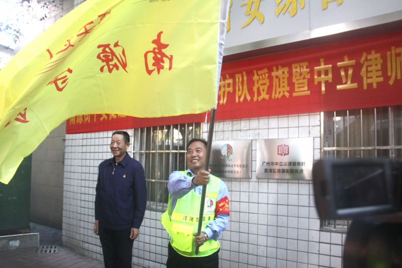 广州市荔湾区委政法委副书记李鄂明为平安守护队授旗