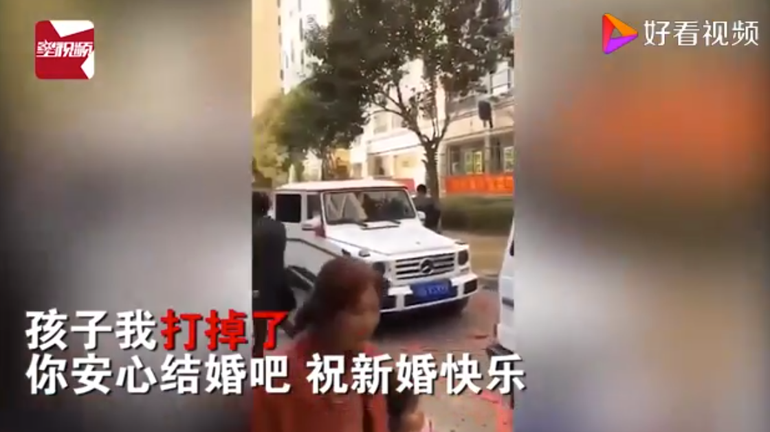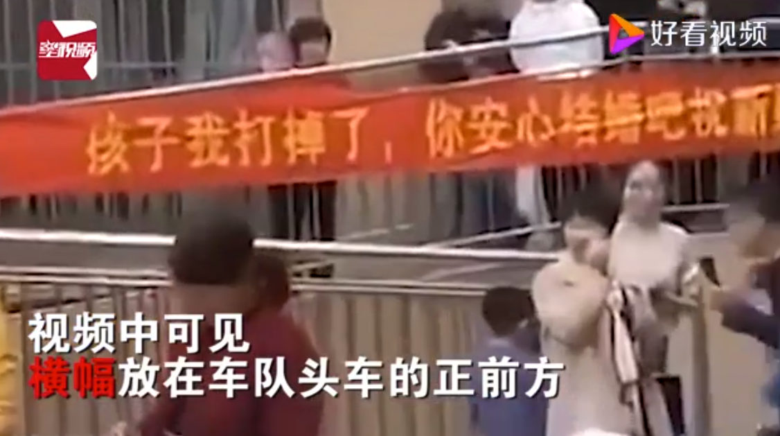 视频画面显示,某小区楼下,疑似一个男子的接亲现场,10多辆花车排成了长龙,浩浩荡荡来接亲。然而就在这无比喜庆的场景,在精心装饰的车队最前面,在新郎进入房子接亲的入口处,挂着一条红艳艳的横幅,上面写着“孩子我已经打掉了,你安心结婚吧,祝新婚快乐。”