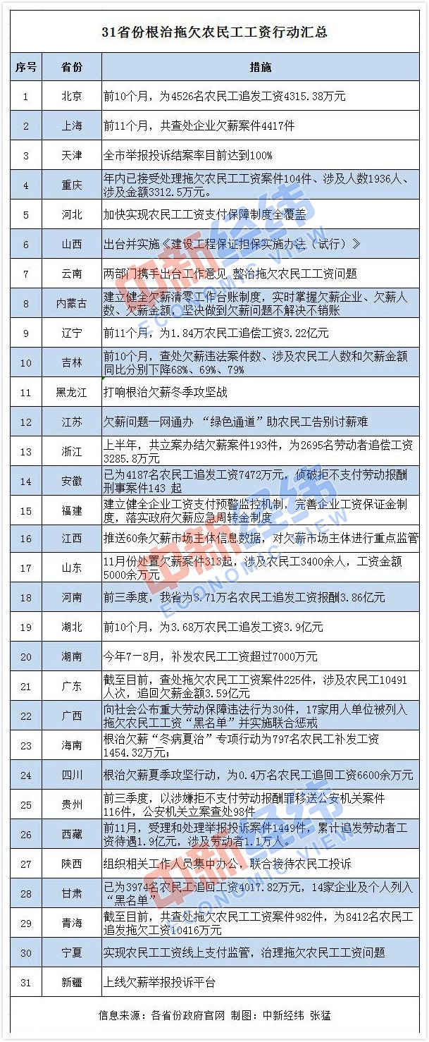 此外,内蒙古建立劳动争议仲裁“绿色通道”,快速调处涉及拖欠农牧民工工资的争议案件;广东、江苏、安徽、贵州等地明确建筑工人采用实名制,发放工资“谁承包谁负责”;上海依托在全国率先建立的欠薪保障金制度,对符合垫付条件的企业劳动者快速先行垫付部分工资;福建、云南、吉林对农民工工资保证金、农民工工资专用账户制度予以明确。
