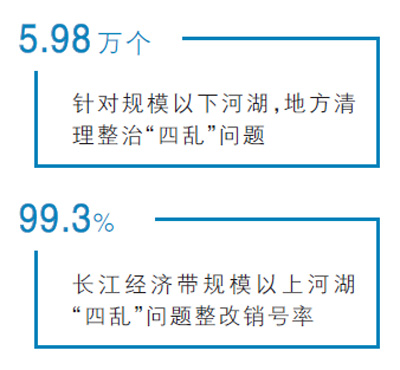 “清四乱”专项行动以来,全国共拆除违法建筑面积3936万平方米,清理非法占用河湖岸线2.5万公里,清除河道内垃圾3500多万吨,整治非法采砂点1万多个、非法砂石2100多万立方米,清除围网养殖近13万亩。2019年,各地问责河长湖长和有关部门负责人3961人次。通过清理整治,河湖面貌明显改善,行蓄洪能力提高,河湖水质逐步向好。