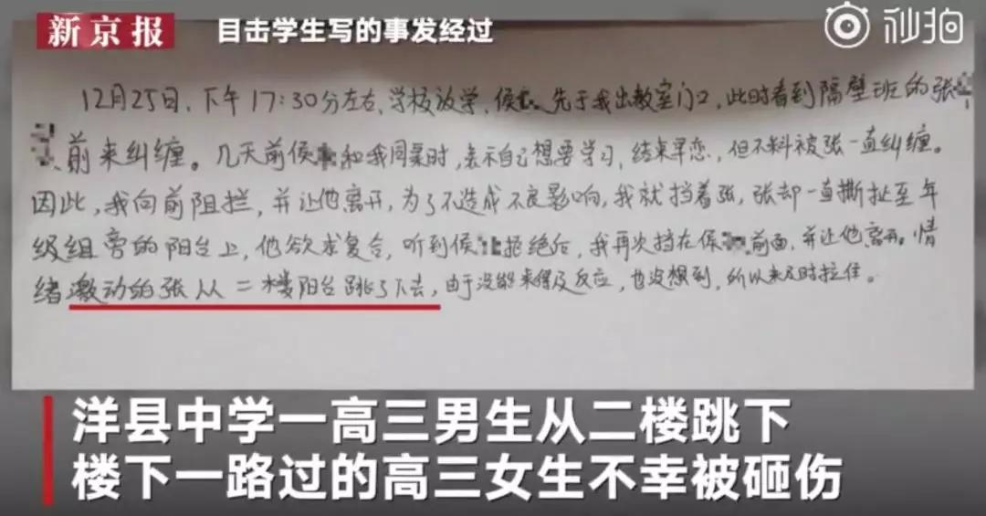据新京报报道,12月25日,陕西汉中洋县中学,一高三男生从教学楼二楼一跃而下,楼下一路过的高三女生不幸被砸中。