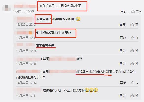 有人认为她可能只是这段时间胖了而已,随后就有人说胖了跟做了填充是两码事,并且指出黄灿灿脸说话的时候脸部都一直非常僵硬,完全没有了原本的灵气和清纯。