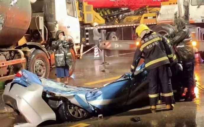 惨烈!海口水泥罐车失控侧翻 致5人死亡 出租车被压成“纸片”