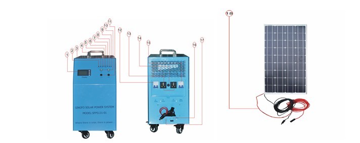 太阳能光伏发电系统是通过一套新能源技术将太阳能转变为电能的装置,解决照明和一些日常电器的基本用电需求。本产品采用一体机设计、是一个集照明、数码产品充电、小型家用电器于一体的电力系统。电源采用高效率PWM 充电模式技术,实现了蓄电池充放电的智能化管理,过充过放保护功能有效的延长了蓄电池的使用寿命;外接家用AC100-240V/300-500W电器、LED灯泡照明和DC12V/USB 5V数码产品充电;太阳能板置于阳光下开启MAIN SWITCH开关即可实现对内置电池充电。