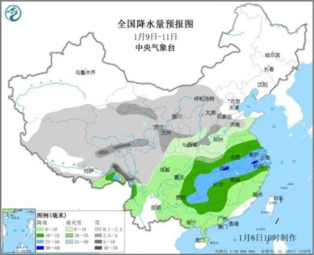【中国新闻网】据中央气象台网站消息,1月9日起我国自西向东将再度迎来大范围雨雪天气。预计9日至11日,陕西南部、湖北西北部、河南、山东一带及以北地区有小到中雪或雨夹雪,青海南部、陕西南部、湖北西北部、河南南部等地局地大雪;江汉、江淮、江南、华南北部等地有中雨、局地大雨。