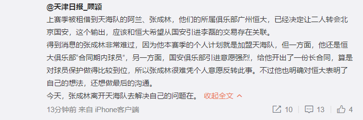 《天津日报》记者顾颖的最新消息:上赛季被租借到天海队的阿兰、张成林,他们的所属俱乐部广州恒大,已经决定让二人转会北京国安,这个输出,应该和恒大希望从国安引进李磊的交易存在关联。