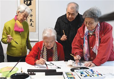 2019年12月5日,朝阳一家养老机构,年逾八旬的老人们相互切磋绘画技艺。