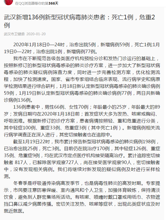 原标题:武汉新增136例新型冠状病毒肺炎患者:死亡1例,危重2例