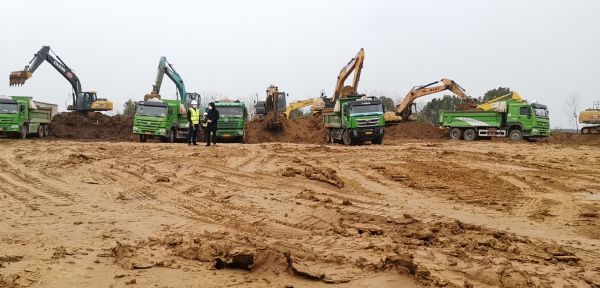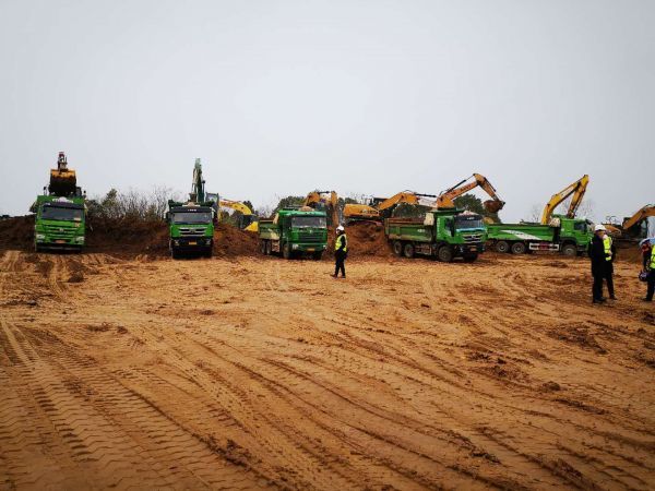 此刻,数十台挖掘机、装载机、推土机在现场施工,正进行芦苇塘填平及铺设碎石路工作。