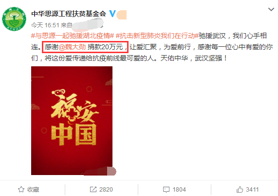 1月29日下午,中华思源工程扶贫基金会发文感谢魏大勋,他捐款了20万。除了魏大勋之外,还有于和伟捐款20万,演员苗苗捐款10万。另外,还有郑爽和家人一起向湖北黄冈红十字会捐款60万,他们都为疫情防控贡献了自己的力量。